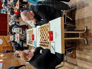 3. Tag – 29.12.2025 und Start in die Finalrunde am 30.12.2025 Unser Team ist wieder am Start. Leider fehlte Max Houben bei der Aufnahme, so dass wir ihn am Spitzenbrett als Kiebitz fotografiert haben: Hier schaut sich Max die Stellung von Marlon Germund am Tisch 1 gegen FM Veaceslav Cofmann genauer an. In der 6. Runde lag Marlon mit einer Qualität mehr sehr gut im Rennen. Sportlich kann am Ende des dritten Tages festgehalten werden, dass unser Daumen drücken erfolgreich war. In einer blitzsauberen Partie bezwang Marlon den FM Cofmann und übernahm die alleinige Tabellenführung mit 5,5 Pkt. aus 6 Partien vor der letzten Runde. Als letzter Teilnehmer bog unser Wolfgang Tochtenhagen auf die Siegesstraße und bezwang Rainer Jonas in einem tollen Endspiel; er steht bei 5 Punkten aus 6 Partien. Damit stehen zwei Bergheimer im Finale um den Gesamtsieg des Bergheimer Winter Open 2025. Alle anderen Spieler liegen bei 4,5 Pkt. aus 6 und können somit nicht mehr an einem der Beiden vorbei. Es wird spannend, wer am Schluss die Nase vorne hat. Das Finale ist „under fire!!“Winter Jubiläums Open 2025